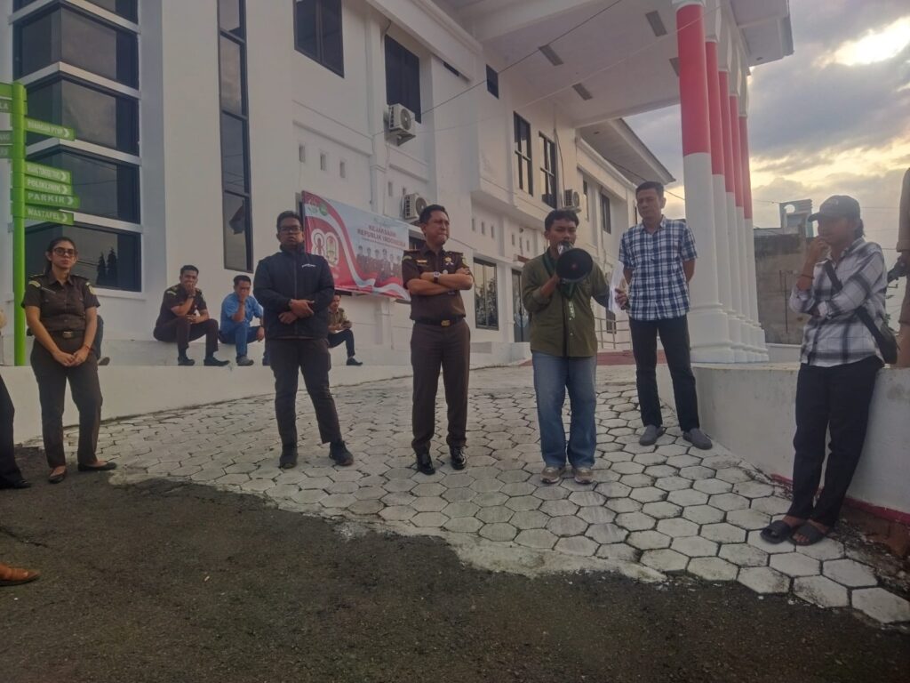 Menanggapi tuntutan mahasiswa, Kepala Kejaksaan Negeri Majene, Andi Irfan, didampingi Kepala Seksi Intelijen Kejari Majene, Muhammad Aslam, turun langsung menemui para pendemo.