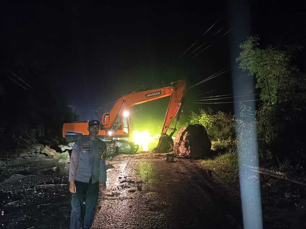 Selain pengamanan, koordinasi cepat juga dilakukan dengan instansi terkait untuk mendatangkan alat berat. Tidak berselang lama, alat berat dikerahkan guna membersihkan material batu besar yang menutup badan jalan. Proses pembersihan dilakukan secara bertahap mengingat ukuran batu yang cukup besar dan kondisi jalan yang licin akibat genangan air.