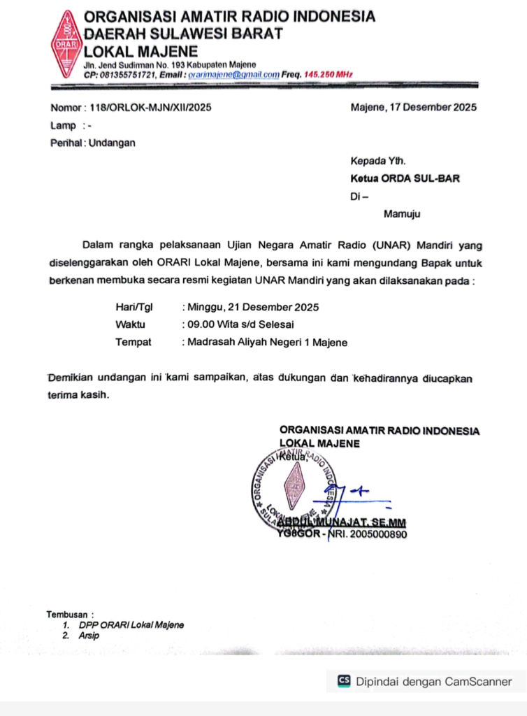 Majene, 17 Desember 2025 β Organisasi Amatir Radio Indonesia (ORARI) Lokal Majene secara resmi mengeluarkan surat undangan kepada Ketua ORARI Daerah (ORDA) Sulawesi Barat yang berkedudukan di Mamuju untuk membuka kegiatan Ujian Negara Amatir Radio (UNAR) Mandiri. Kegiatan tersebut dijadwalkan berlangsung pada Minggu, 21 Desember 2025, bertempat di Madrasah Aliyah Negeri (MAN) 1 Majene.