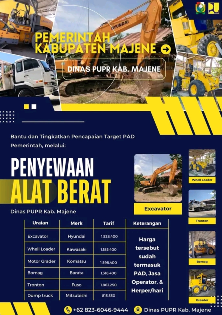 Adapun jenis alat berat yang tersedia beserta tarif resmi per hari yang ditetapkan oleh Dinas PUPR Kabupaten Majene, yakni: