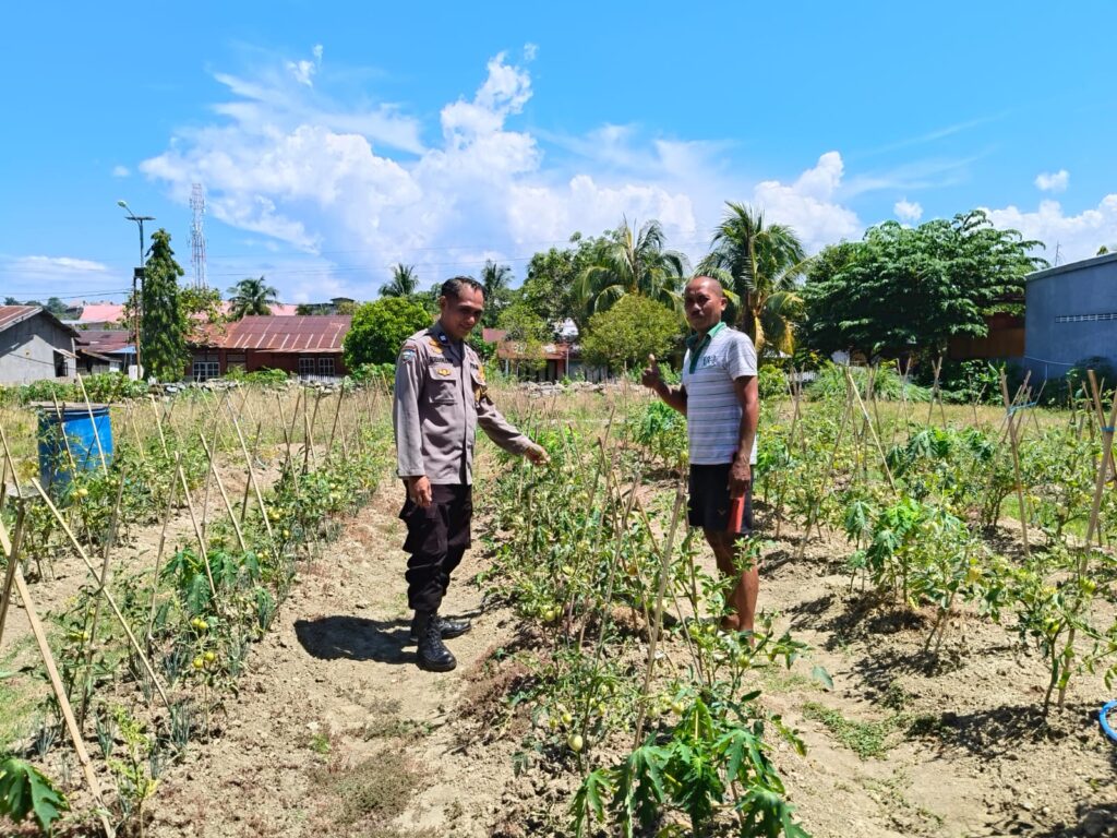 Dalam kegiatan tersebut, AIPTU Burhanuddin meninjau langsung kondisi lahan pekarangan yang dimanfaatkan secara produktif oleh warga dengan menanam tanaman hortikultura jenis tomat. Tanaman tersebut tampak tumbuh subur dan kini telah memasuki masa panen, menjadi bukti nyata keberhasilan pemanfaatan lahan pekarangan untuk mendukung kebutuhan pangan keluarga.